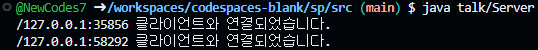 - 포트 번호는 동일하다. 각 스레드에 새로운 포트 번호가 할당되는 게 아니다. 포트 번호는 각 프로세스에게 부여되는 식별 번호라고 했었다. 스레드는 개념적으로 프로세스에 종속되기에 같은 포트 번호인 게 맞다.